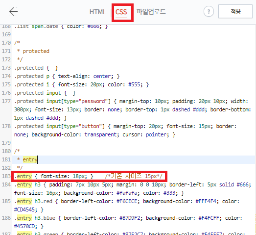 entry 로 검색하셔서 상기 적색 마크 부분을 찾으시고, 원하는 크기로 설정하시면 됩니다. 기본값은 15px로 되어 있습니다. 전 18px로 적용하였고, 본 블로그 본문 폰트 크기로 보시면 됩니다.