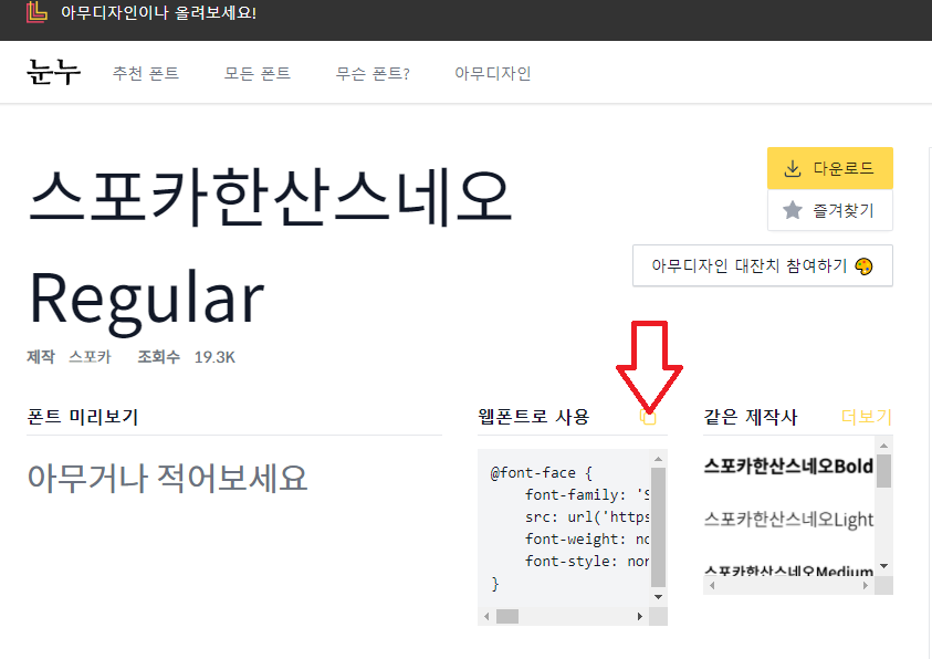 웹폰트로 사용 부분을 클릭하여 복사를 합니다.