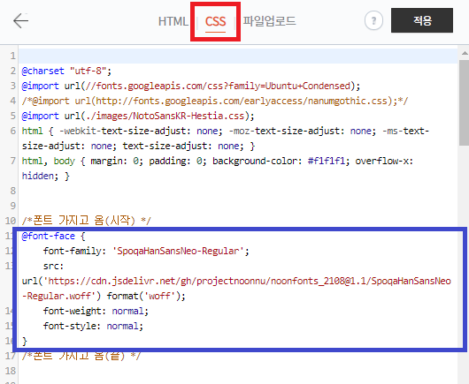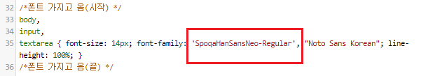 그리고 상기의 위치를 찾아서 폰트 사이트에서 복사한 코드를 붙여 넣기 합니다. 파란색 마킹이 폰트 사이트에서 복사한 코드입니다.