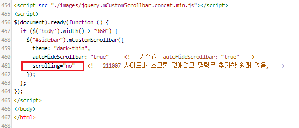 제 경우는 상기와 같이 해도 사이드바가 글에 따라 이동은 되는데 하단부가 잘리게 되던데, 스크롤 기능 제거로 해결되었습니다. 아래와 같이 HTML 편집에서 명령어 하나만 추가하시면 됩니다. 위치는 제일 아래에 있으며 빨간색 마킹된 scrolling="no" 를 입력하면 됩니다.