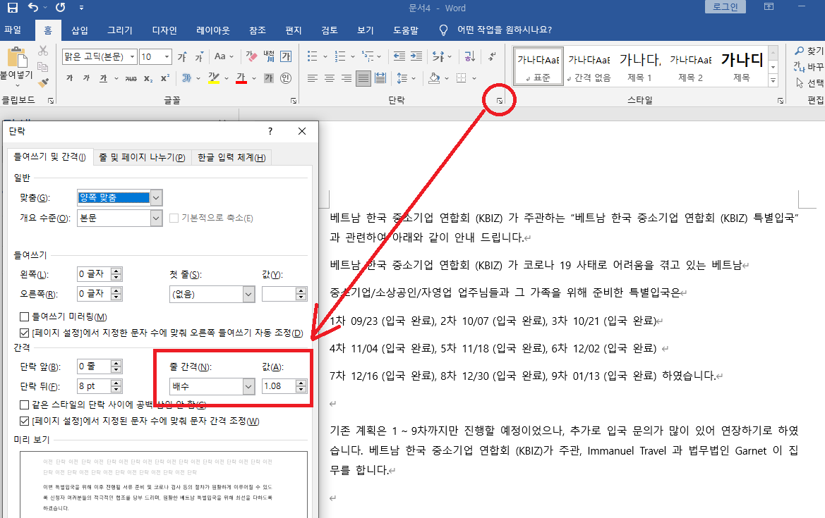 동그라미 부분을 클릭하면 '단락' 창이 뜨면서 초기 설정값이 '배수', '1.08'로 나옵니다.