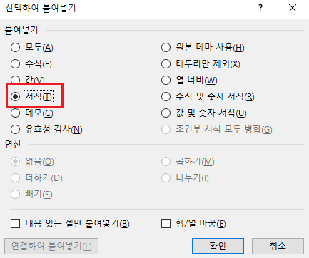 Ctrl + Alt + V : 서식복사 적용 단축키입니다. 적용하고자 하는 내용을 클릭한 후 단축키를 누릅니다. 그리고 서식을 선택합니다.