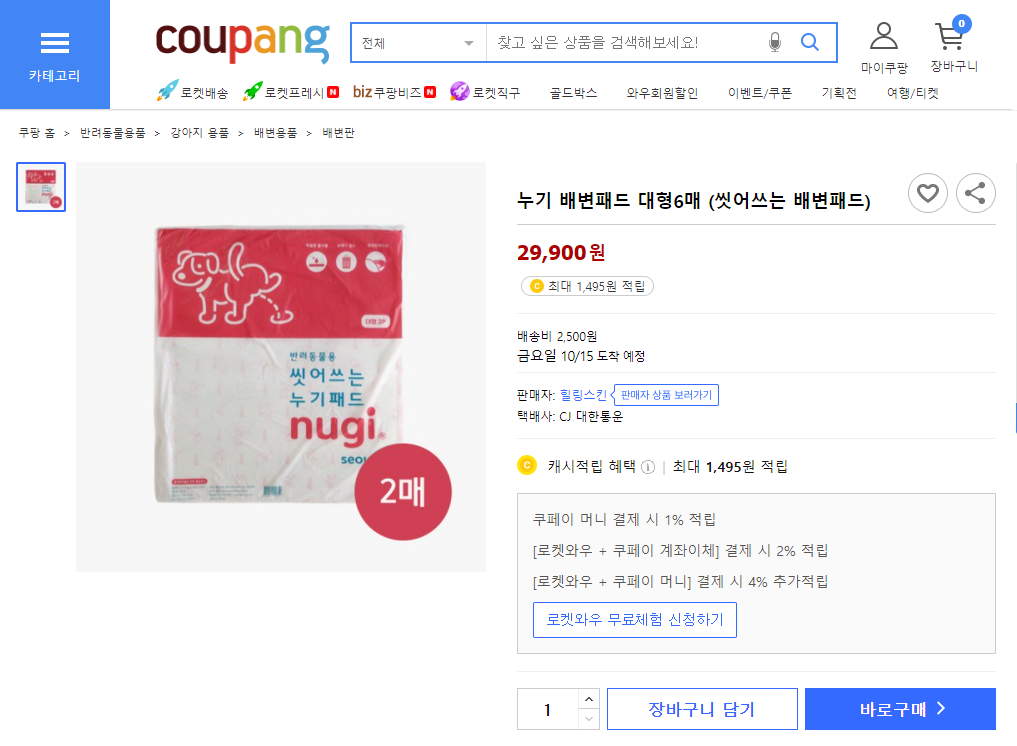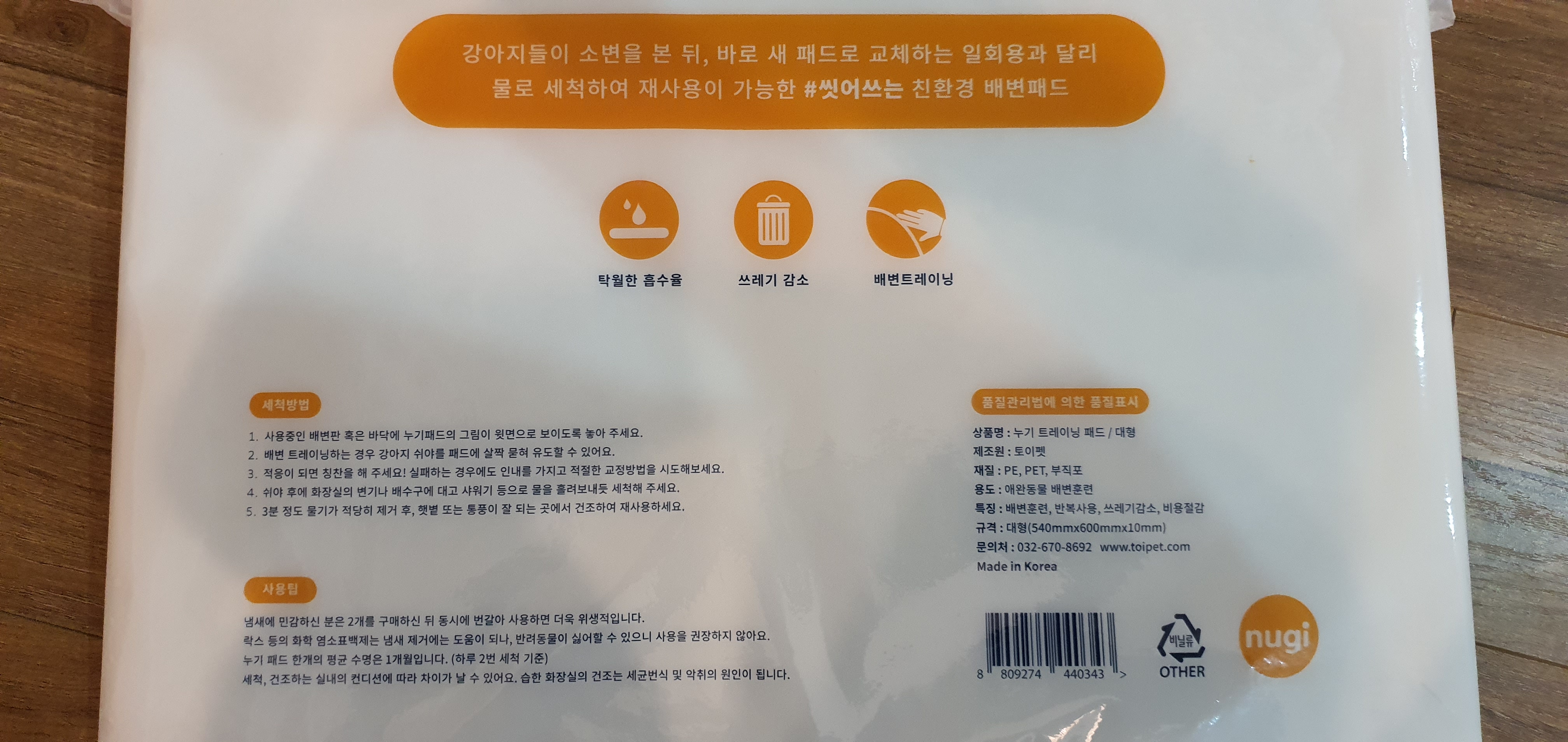 반려견을 키운 지 7년 정도 되었고 그동안 배변 패드는 여러 가지 써보았지만 올해 초부터는 씻어 쓰는 누기 패드란 상품을 사용하고 있습니다. 제일 간편하고 가성비가 좋아습니다. 혹시 모르시는 분들은 보시고 참조해 주시기 바랍니다.