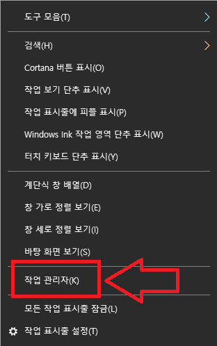 첫 번째는 작업표시줄에서 마우스 오른쪽 버튼을 눌러서 '작업 관리자'를 클릭하여 실행할 수 있습니다.