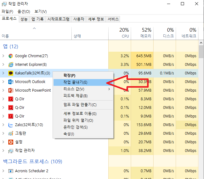 만약 카카오톡 프로그램이 멈춤 상태고 오류가 생겼을 경우 작업 관리자 실행하여 들어가 보면 해당 프로그램에 '응답 없음' 등의 문제 메시지가 뜹니다. 이때 마우스 오른쪽 버튼을 클릭하여 '작업 끝내기(E)'를 클릭해서 해당 프로그램을 종료하고 필요시 다시 실행하면 됩니다.
