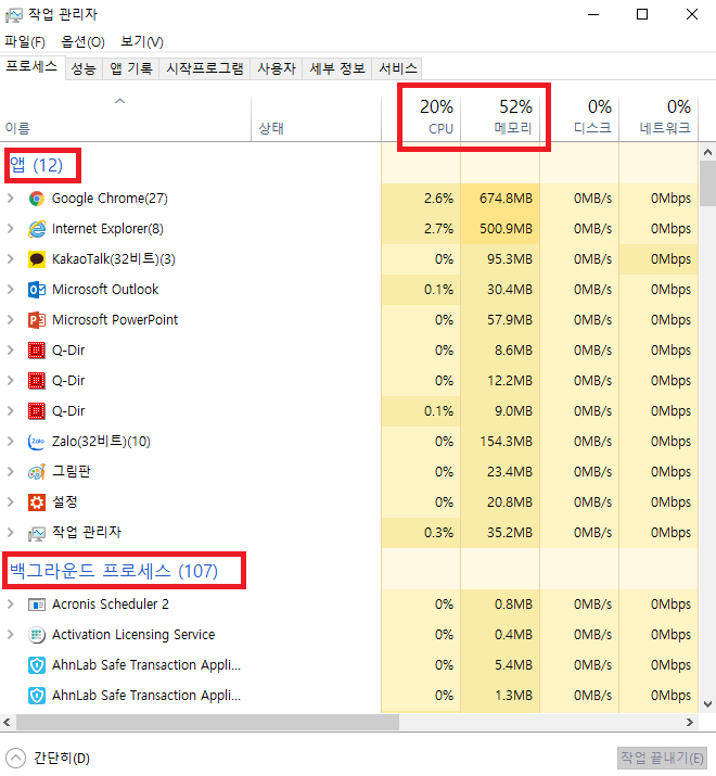 보시다시피 수많은 프로그램들이 실행되고 있으며 'CPU', '메모리' 탭을 보면 각 프로그램마다 할당량을 확인하실 수 있습니다.