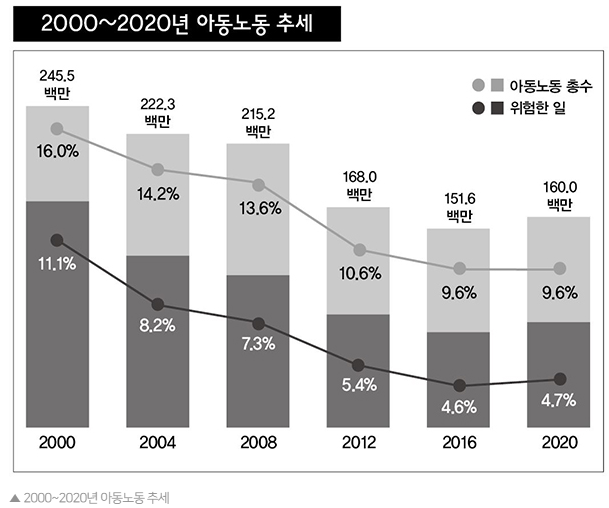 국제노동기구(ILO)와 국제연합 아동 기구(UNICEF)는 지난 12일 ‘아동노동: 2020년 글로벌 추계, 동향과 나아갈 길’이라는 제목의 보고서를 내고 2020년 아동노동의 총수가 1억 6천만 명까지 증가했다고 발표했다. . . . 무엇보다도 가난한 개발도상국에 경제적 타격을 가하고 있는 코로나19 전염병에 국제 사회가 제대로 대응하지 못한다면, 2020년 말 1억 6천만 명이었던 아동노동 총수가 2022년 말에는 1억 6천890만 명으로 900만 명 가까이 늘어날 수 있다고 ILO는 경고하고 있다. . .