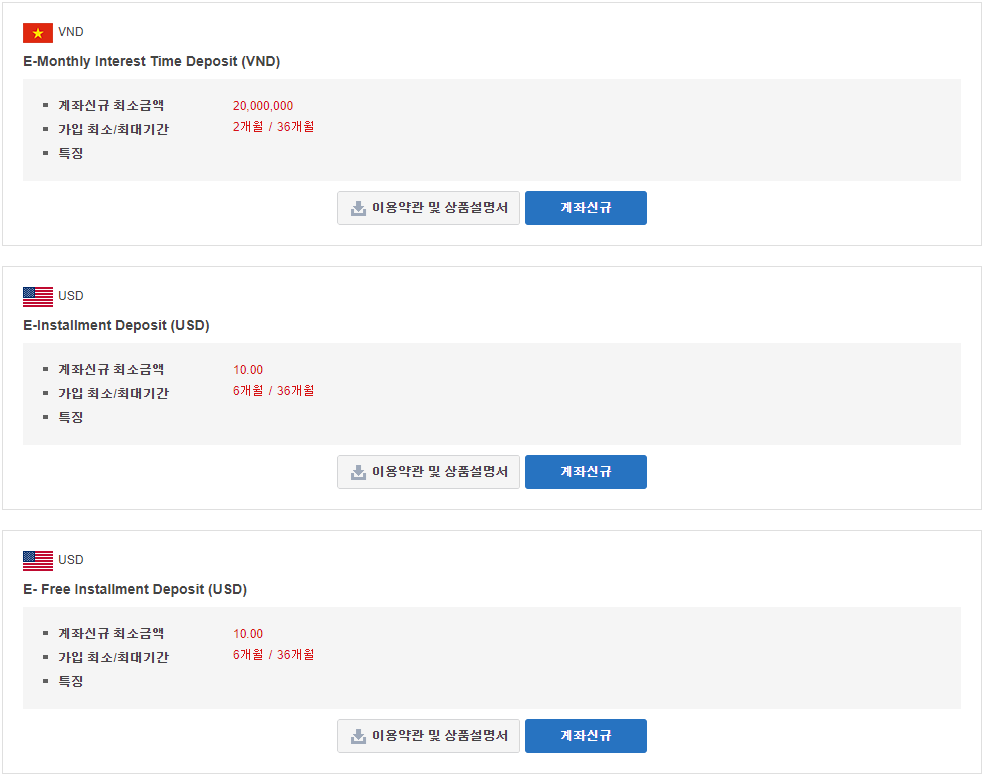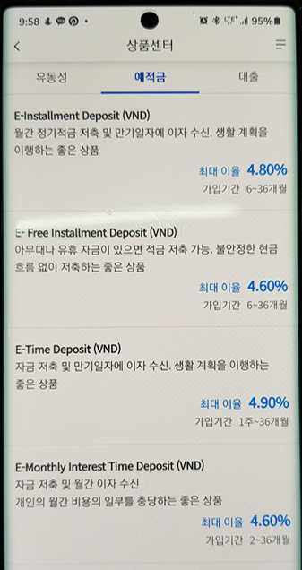 설치 후 적금 관련 메뉴로 들어가면 각 베트남동(VND) 적금 상품에 대한 이율과 조건들을 볼 수 있습니다.