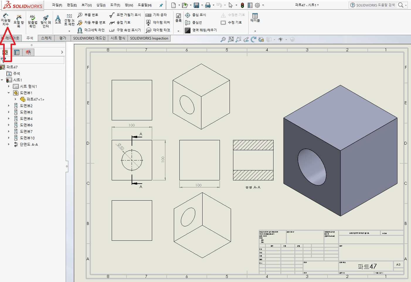 그리고 '지능형 치수'를 메뉴를 클릭하여