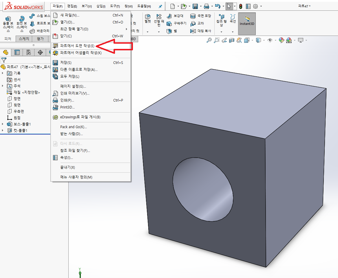 '파일' 메뉴의 '파트에서 도면작성'을 클릭합니다.