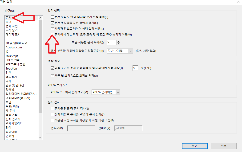'문서' 탭에 '문서에서 메뉴 막대, 도구 모음 및 창 조절 단추 숨기기 허용'을 해제합니다.