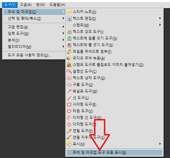 '주석 및 마크업 도구 모음 표시'를 클릭합니다.