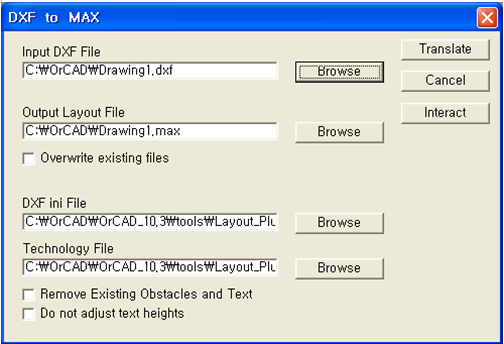 2. “input DXF File” 의 Browse를 클릭하여 AutoCAD 작업에서 마무리한 DXFDXF 파일을 선택한다 자동적으로 “Output Layout File"엔 같은 경로에 max 파일이 생성될 것이다. (max 파일이 PCB 파일임) "Translate" 버튼을 클릭하여 변환한다.