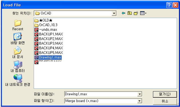 3. 초기에 회로도의 NNL 파일을 토대로 한 MAX 파일을 불러들이고 메뉴창 "FILE→LOAD"를 클릭하여 아래와 같은 창이 나오면 “파일 형식”을 "Merge board(*. max)"를 선택하고 AUTO CAD를 이용하여 만든 MAX 파일을 선택하고 “열기”를 클릭한다.
