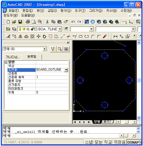 6. 모두 선택을 하고 왼쪽 메뉴 “도면층” 설정을 BOARD_OUTLINE으로 설정한다. 초기엔 BOARD_OUTLINE이 없으니 다른 DXF 파일을 복사하여 생성시킨다. 그리고 확장자명 DXF 파일로 저장한다.