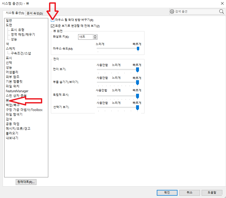 [SOLID WORKS] 솔리드 웍스 마우스 휠 조작 변경 방법