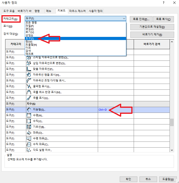 단축키 설정하고자 하는 명령어를 찾습니다.