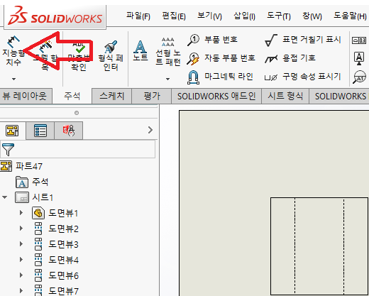 '지능형 치수'는 도구(T)의 치수(S)에 있는 것으로 확인됩니다.