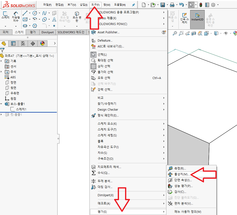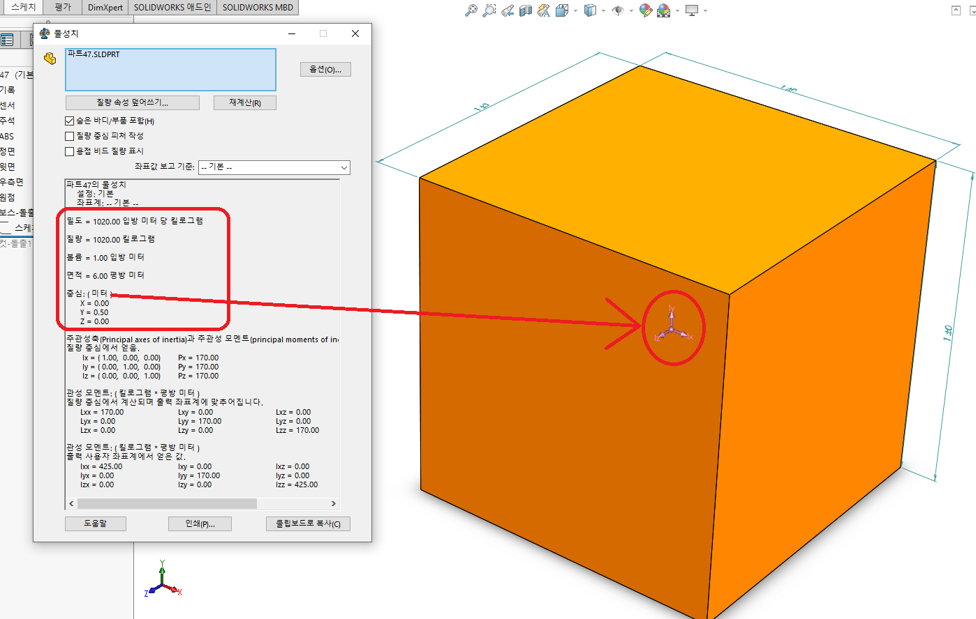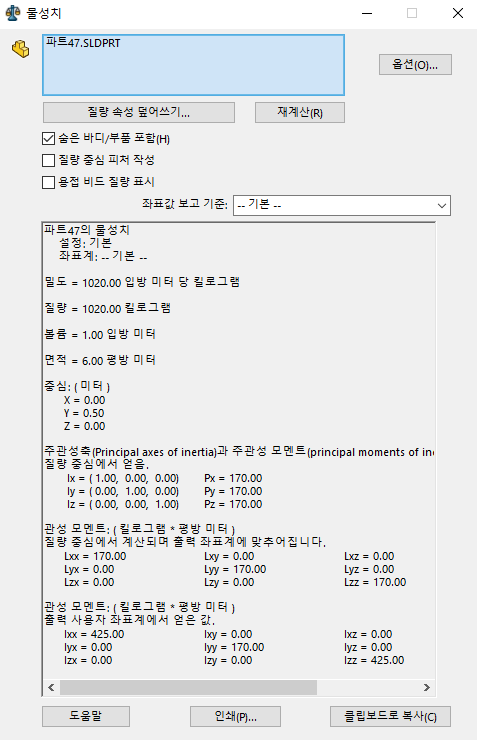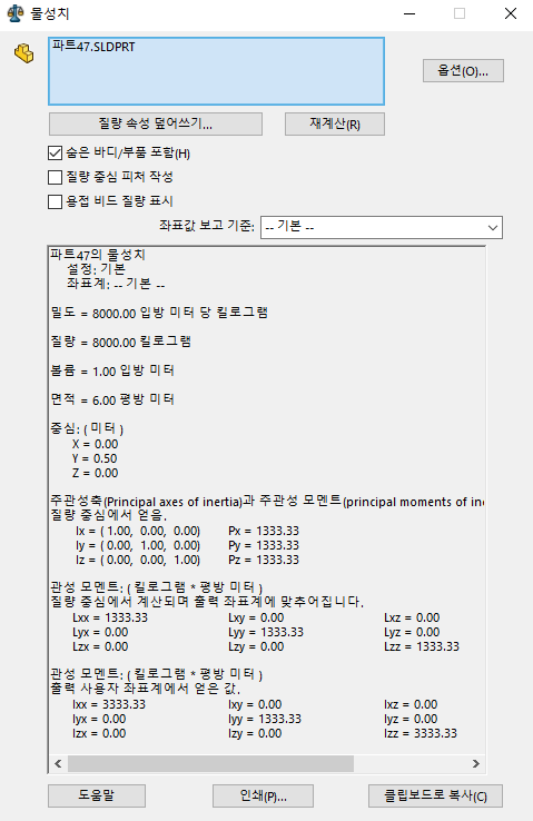[SOLID WORKS] 솔리드 웍스 물성치(무게, 볼륨, 면적 등) 정보 확인