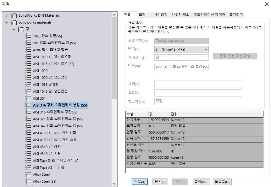 우측 창에 보면 탄성계수 등 물성치 정보가 나오기에 확인 가능합니다.