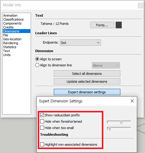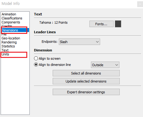 'Dimensions', 'Units' 부분이 치수 관련 설정하는 부분입니다.