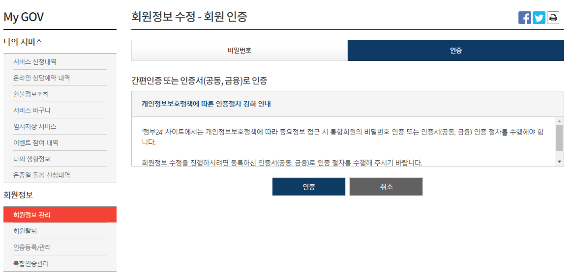 그리고 '수정' 을 클릭하고 '인증'을 클릭하여 인증을 받습니다.