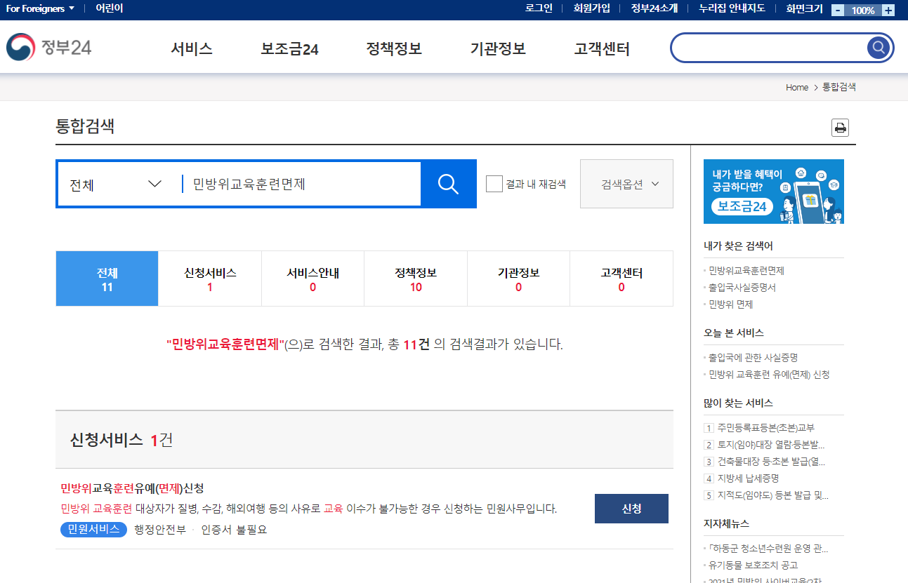 민방위 교육훈련 면제를 신청할 수 있습니다.