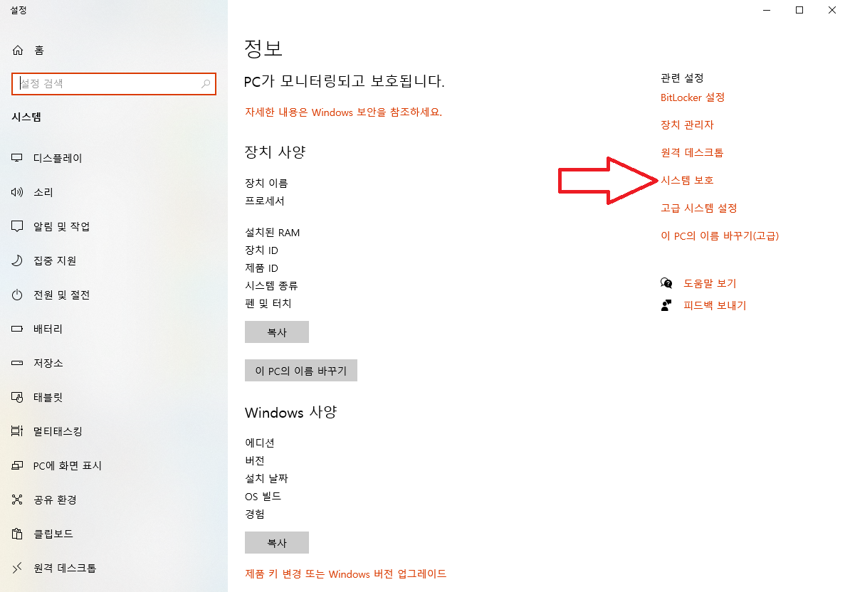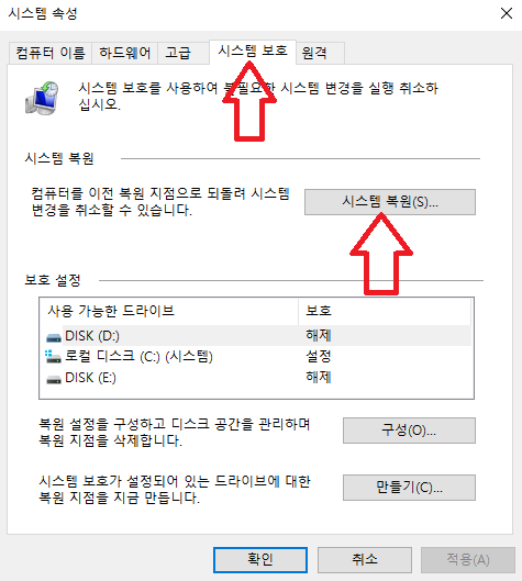 아래의 창에서 '시스템 보호' 탭을 클릭하고