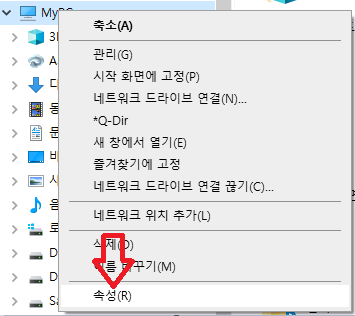 마우스 오른쪽 버튼을 클릭하고 '속성'을 클릭합니다.