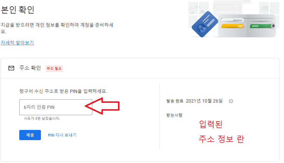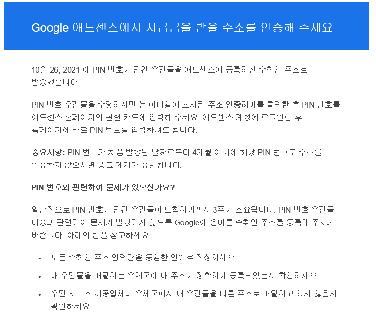 2021.10.26 '애드센스에 등록된 수취인 주소를 인증해 주세요' 란