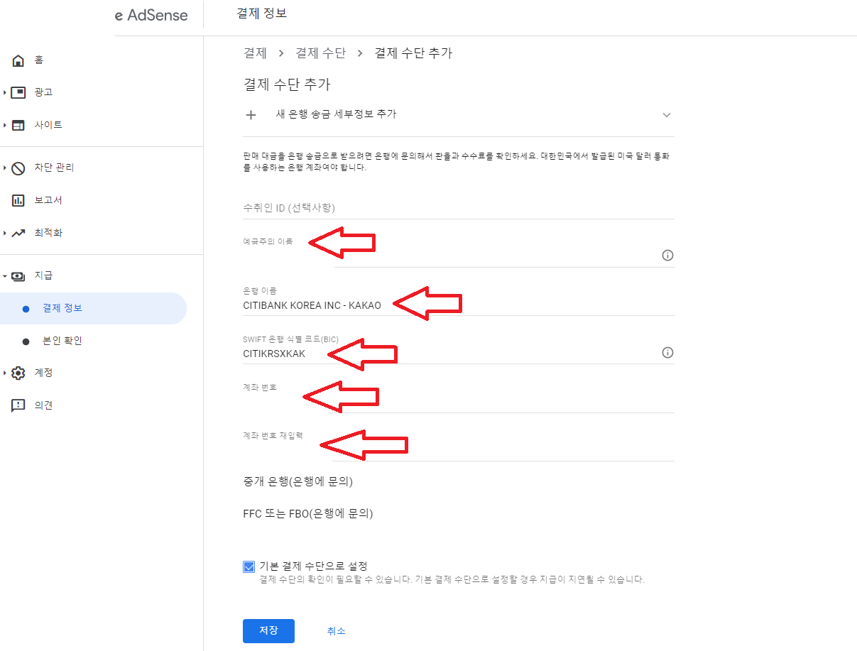 이름은 영문으로 입력, 계좌번호도 입력합니다.