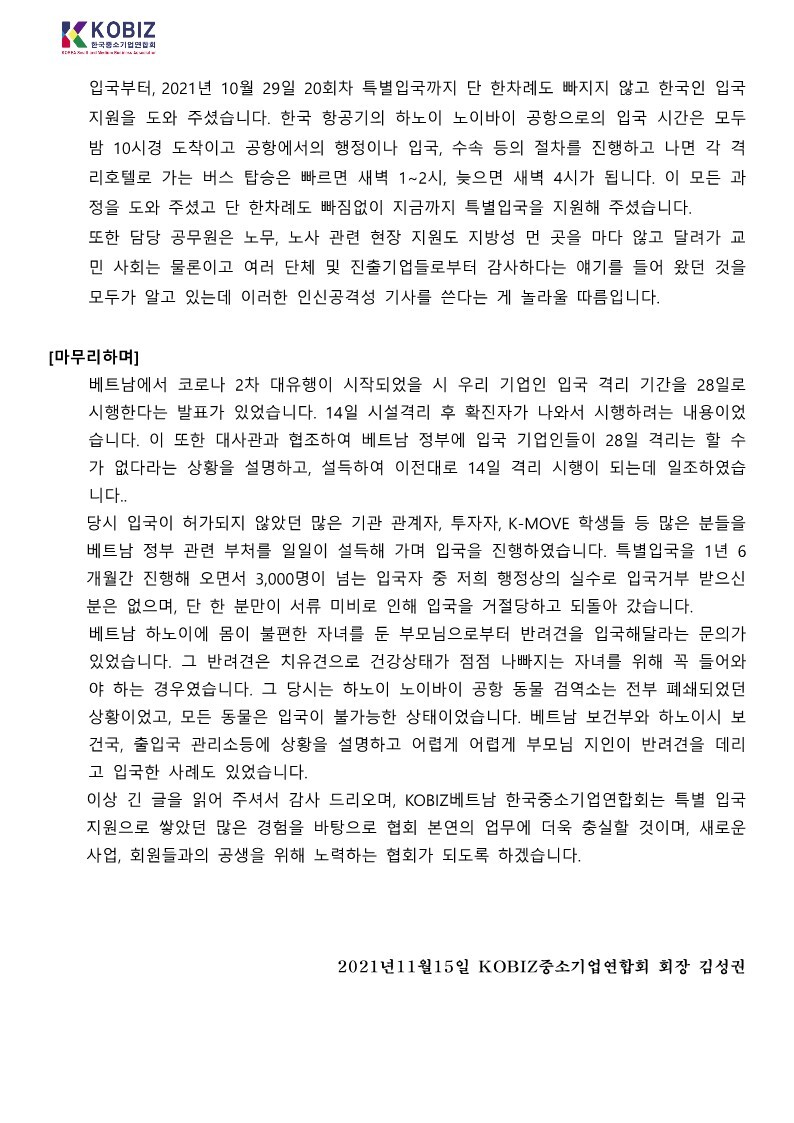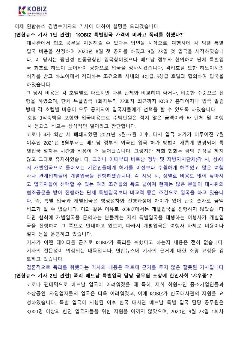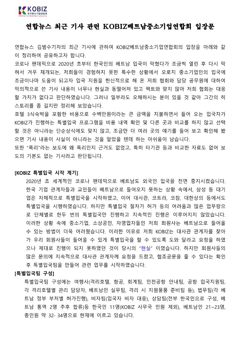 연합뉴스 최근 기사 관련 KOBIZ 베트남중소기업연합회 입장문