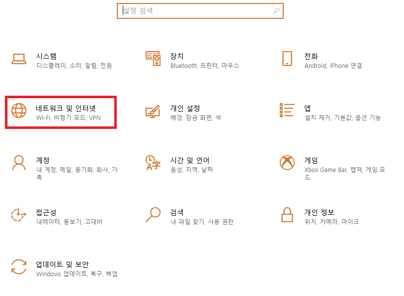' 네트워크 및 인터넷 ' 을 클릭합니다.