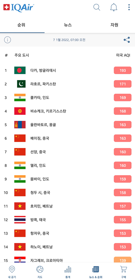 나라/도시별 미세먼지 순위를 실시간 확인 가능합니다.