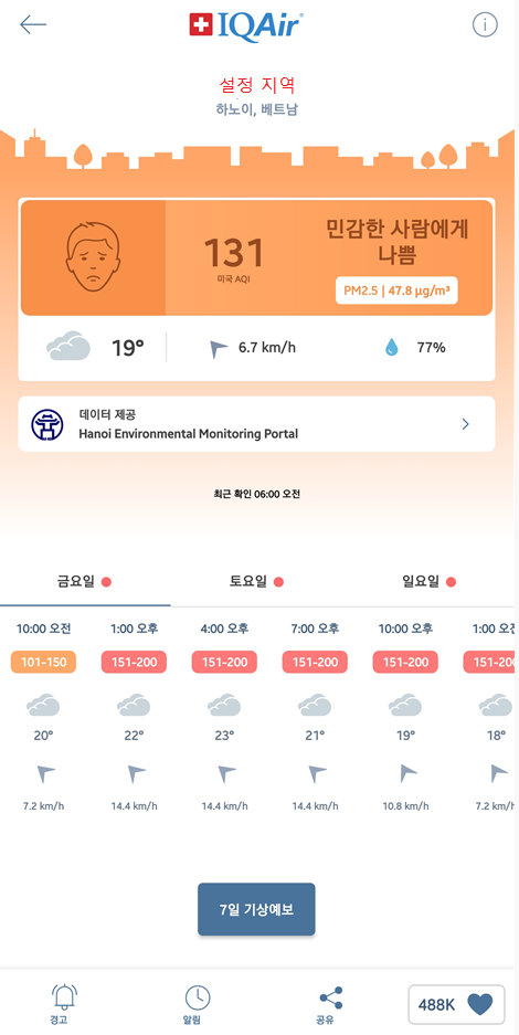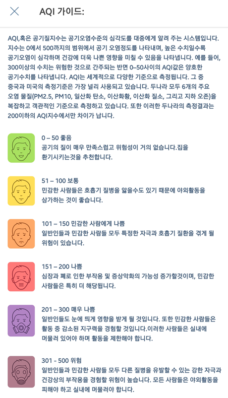 + 건강 조언 : AirVisual의 조언에 따라 대기 오염 노출을 최소화 하여 건강을 보호 할 수 있습니다.