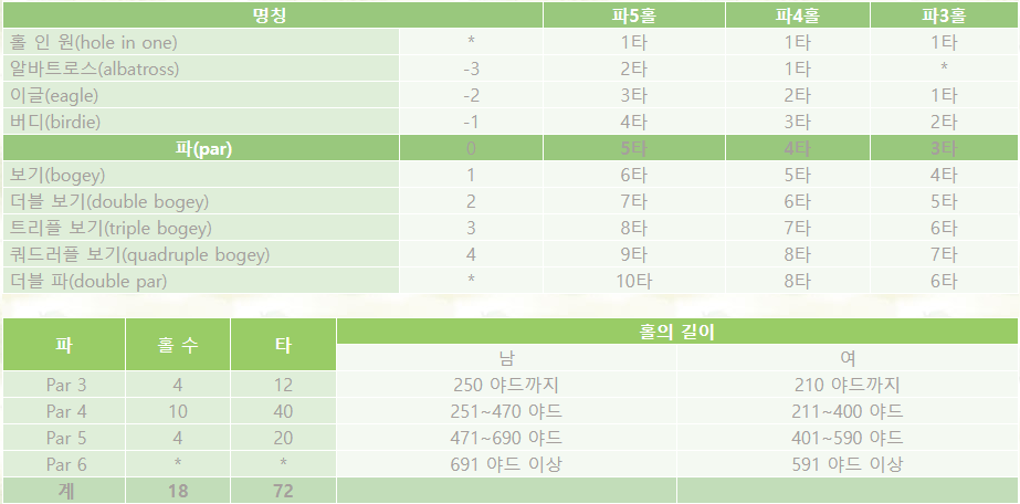 티 그라운드를 출발하여 홀을 마치기까지의 정해진 기준 타수로 거리에 타라 파5 (롱홀), 파4(미들 홀), 파3(숏홀)로 구별됨