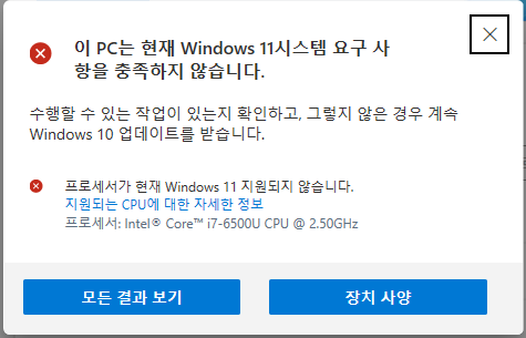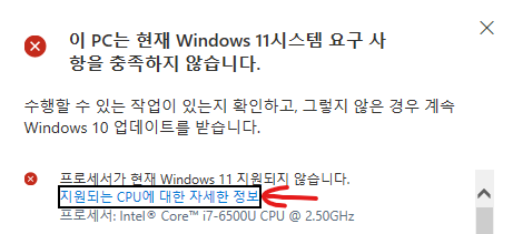 이 PC는 현재 Windows 11 을 실행하기 위한 최소 시스템 요구사항을 충족하지 않습니다.