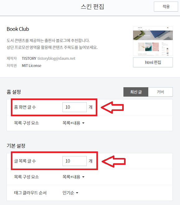 [기본 설정]의 [글 목록 글 수]는 카테고리를 클릭