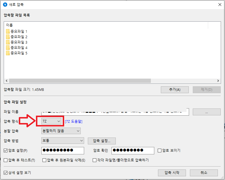 이때 압축 시 압축 형식을 [7Z]를 선택하여 압축을 하면