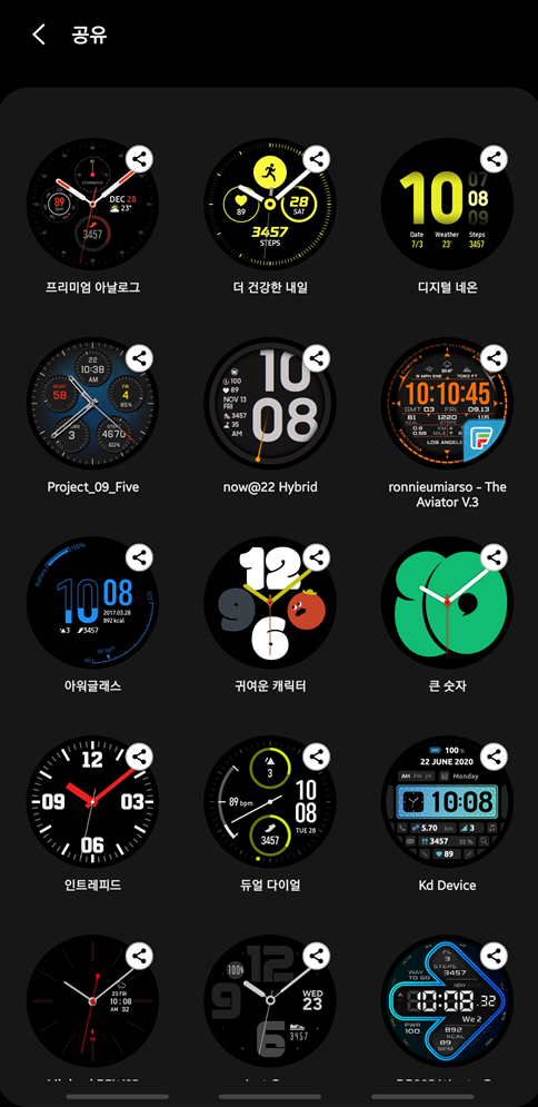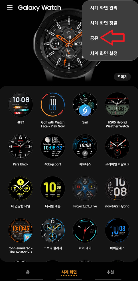 공유할 시계화면을 고른다음 공유 아이콘을 클릭합니다.