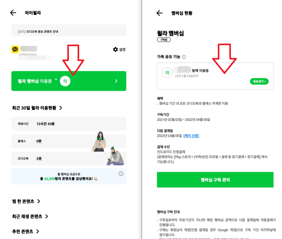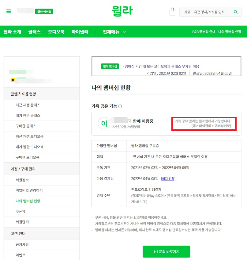▼가족공유 관리는 휴대폰 윌라앱에서 가능합니다.