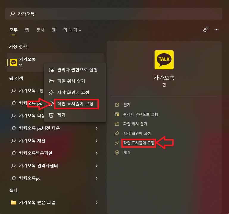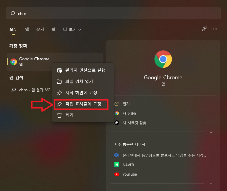 [작업 표시줄에 고정] 버튼을 클릭을 합니다.