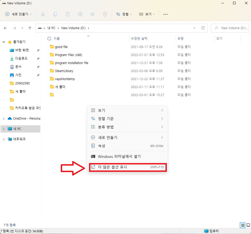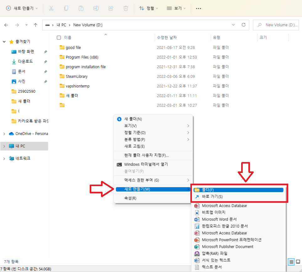 새폴더를 만들 경우 탐색기 빈 화면에 마우스 우측 버튼을 클릭합니다.