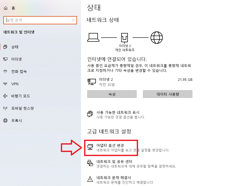 아래의 창이 생성되고 [어댑터 설정 변경]을 클릭하면