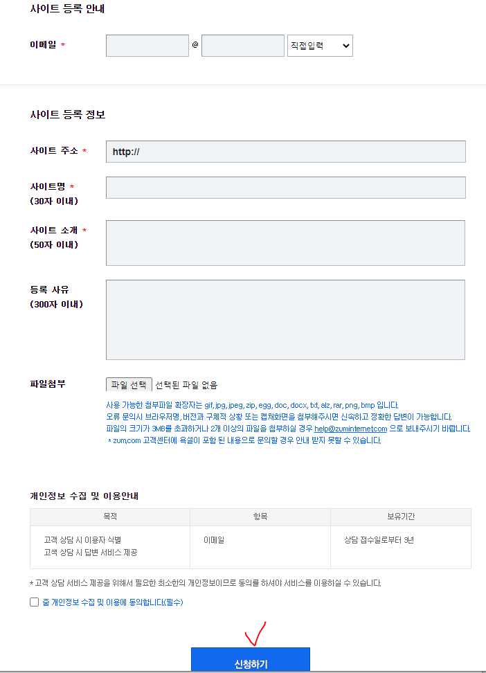 상기 내용 작성 후 '신청하기' 클릭