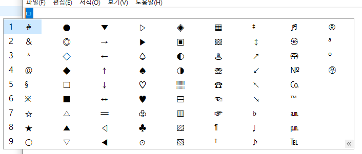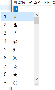각 자음별 해당하는 특수문자들이 나옵니다.