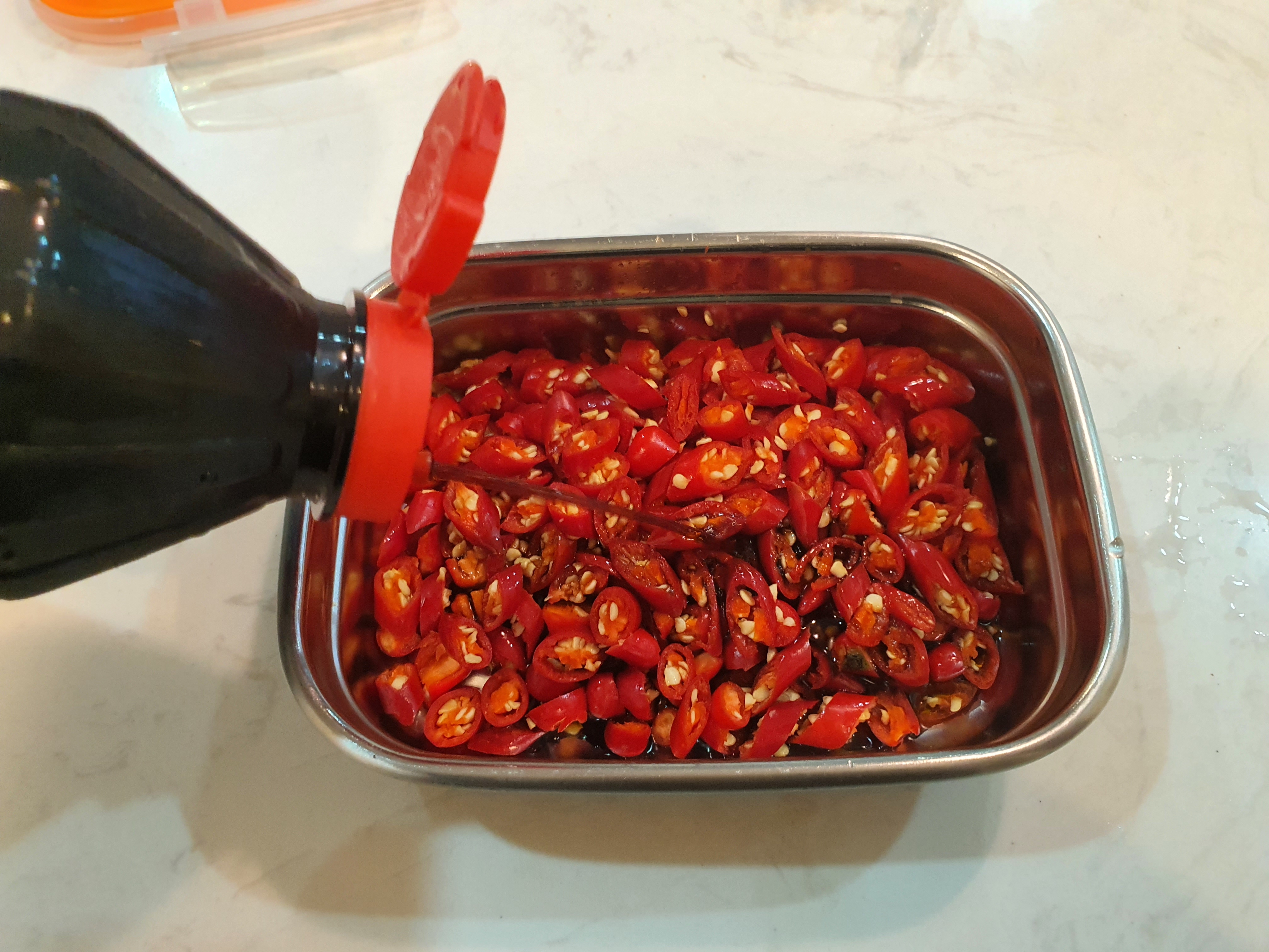 양념통에 잘게 썰은 다음 간장을 붓고,