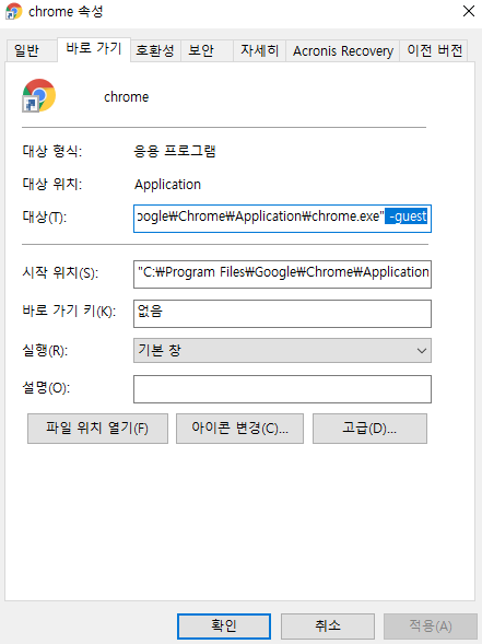 필자 같은 경우는 크롬 바로가기를 2개를 설정하여