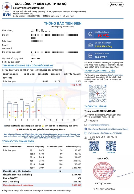 아래는 베트남전력공사(EVN)에서 발행되는 전기세 고지서입니다.
