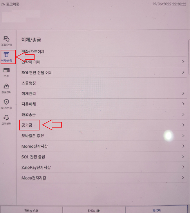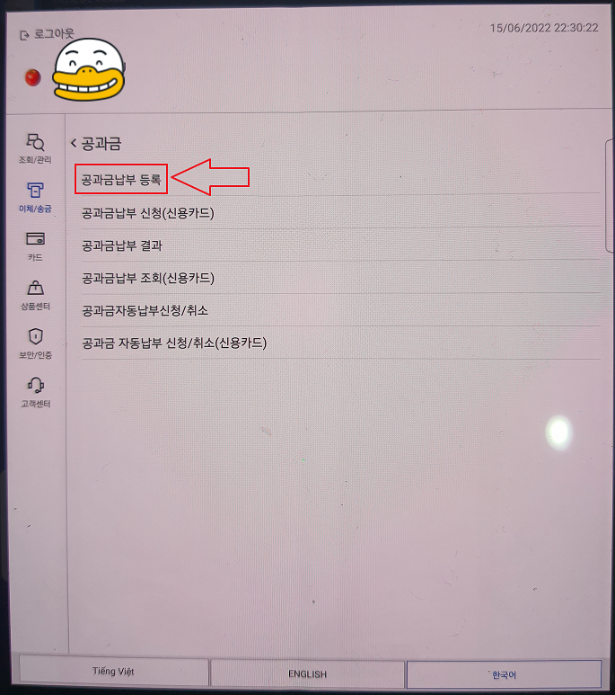 ▼[이체/송금] [공과금] 순으로 들어갑니다.